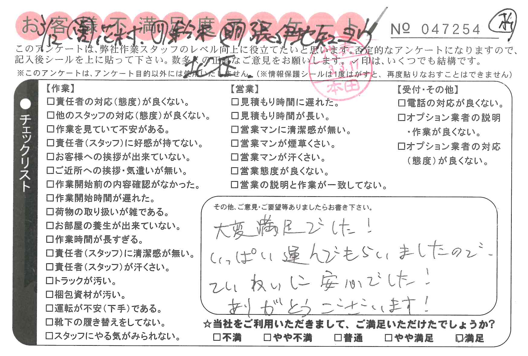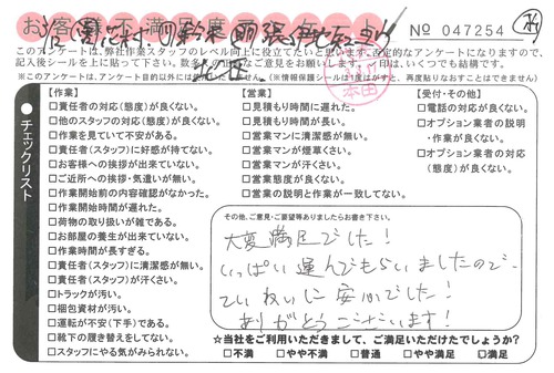 引越一番でお引越しをしていただいたお客様のうち、コメントいただいたアンケートを全て掲載しています。