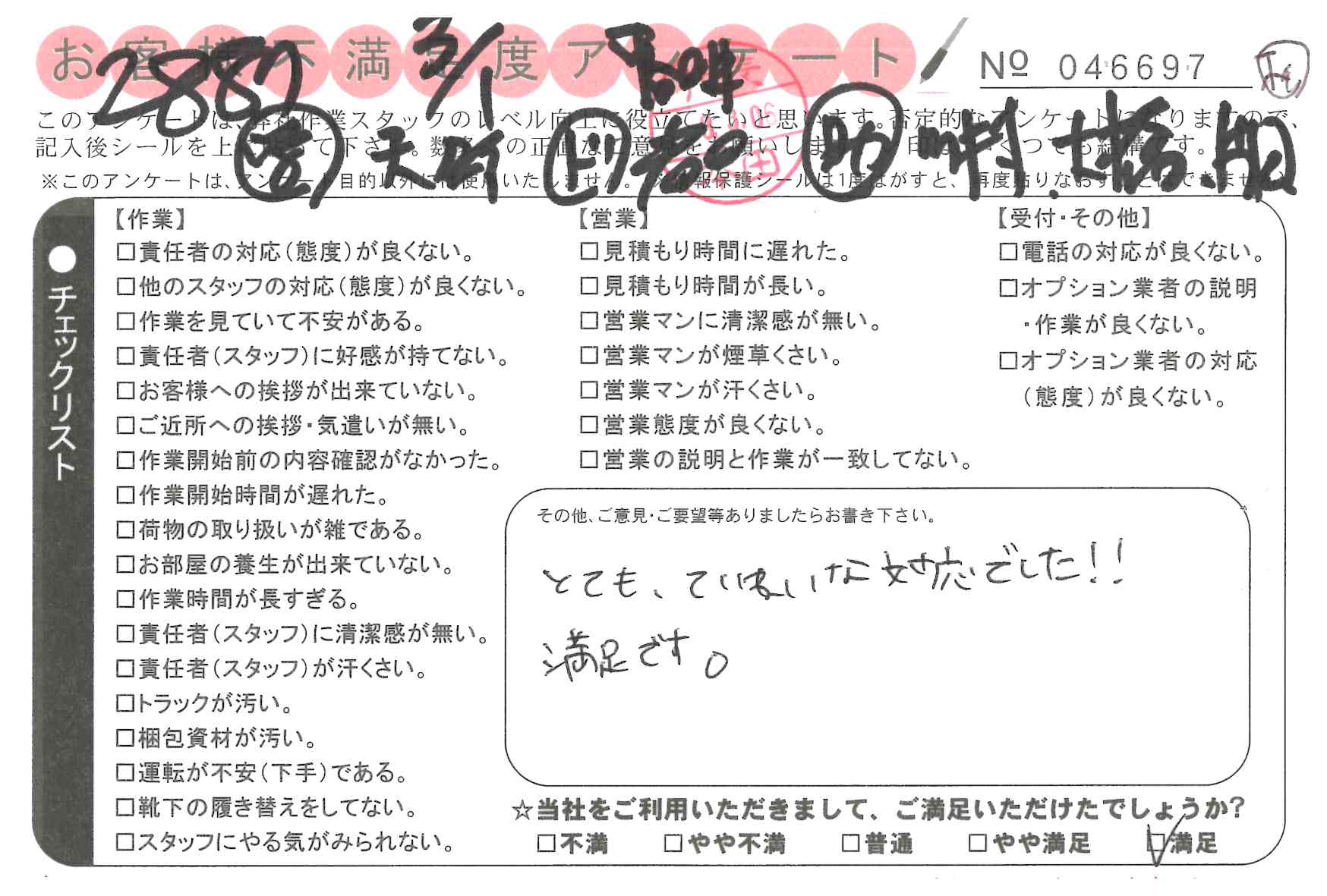 2/28 引越 営業:天野 ドライバー:本名 スタッフ:赵* 迅速かつ丁寧な対応をありがとうございます。