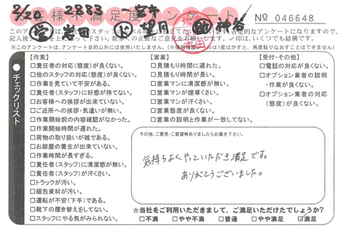 2/20 引越 営業:岩田 ドライバー:望月 スタッフ:神谷* 気持ちよくやっていただき、満足です。