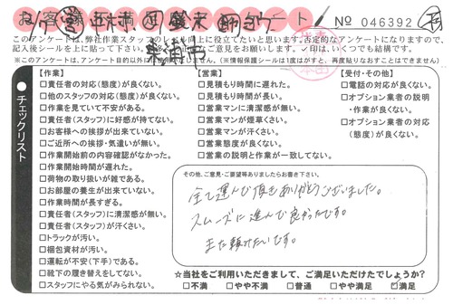 引越一番でお引越しをしていただいたお客様のうち、コメントいただいたアンケートを全て掲載しています。