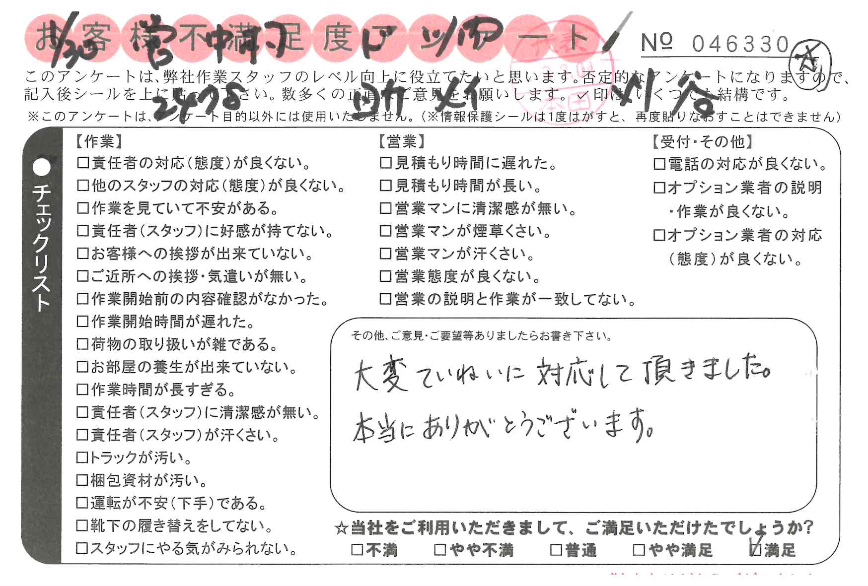 1/30 引越 営業:浅井 ドライバー:鈴木 スタッフ:張・ホウ・楊* 引越作業の方は、非常に良くやっていただきました。