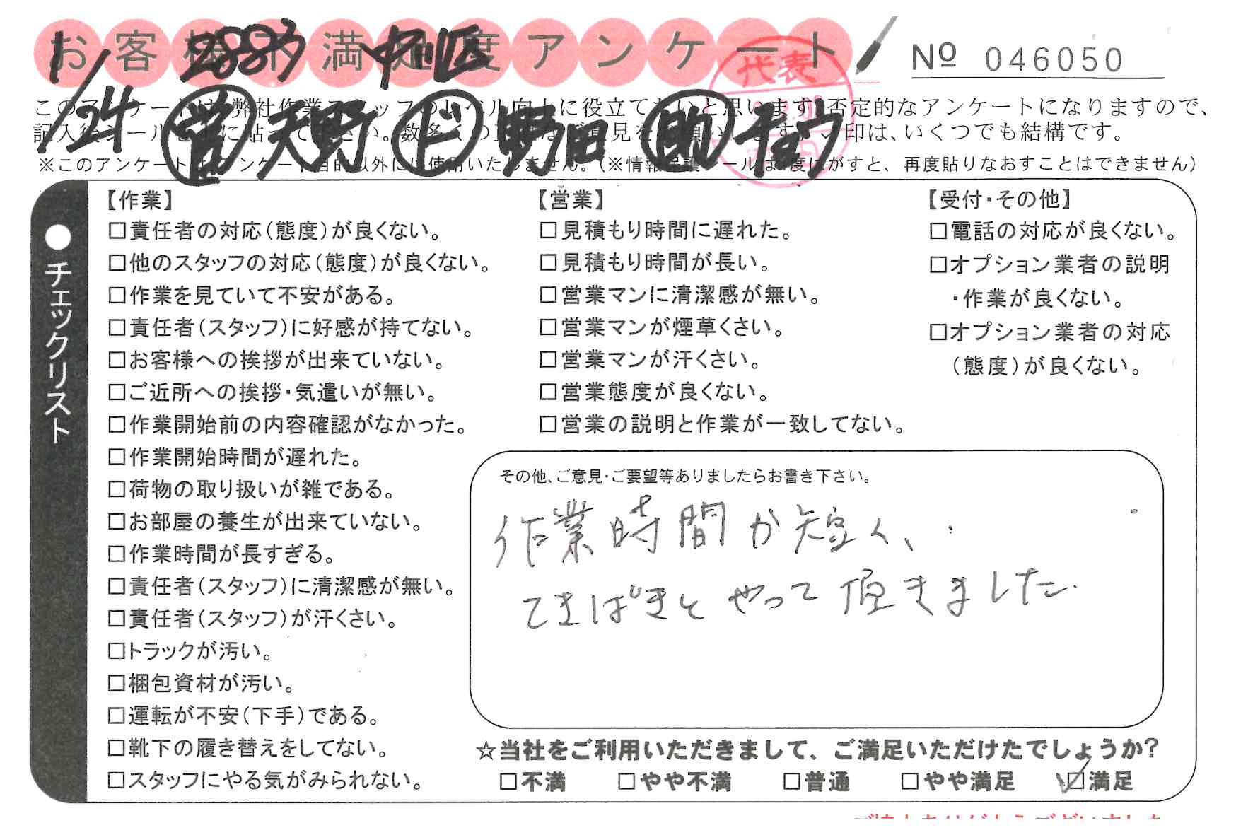1/24 引越 営業:天野 ドライバー:野田 スタッフ:赵* 作業時間が短く、てきぱきとやって頂きました。