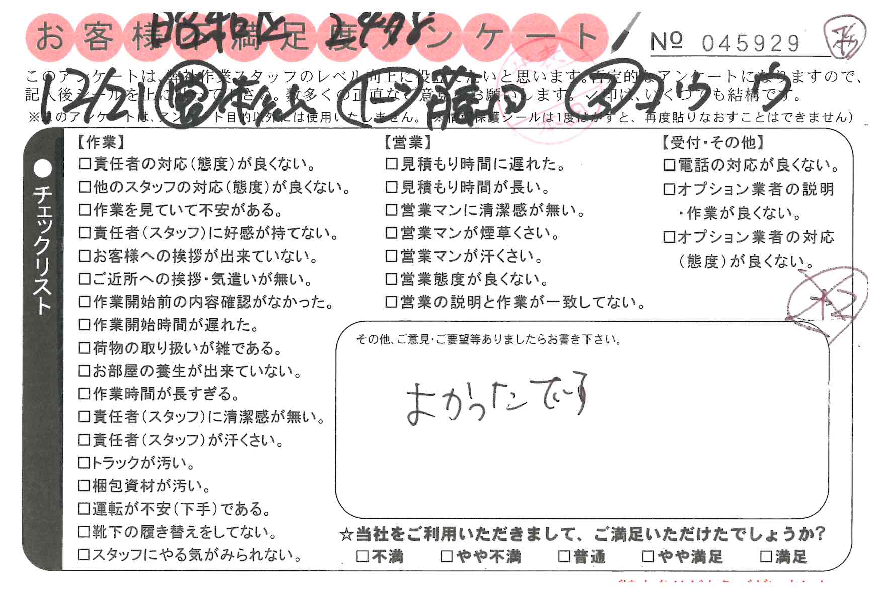 不満足度アンケートを行っている引越一番では、不評なアンケートも、好評なアンケートも全て掲載しています。