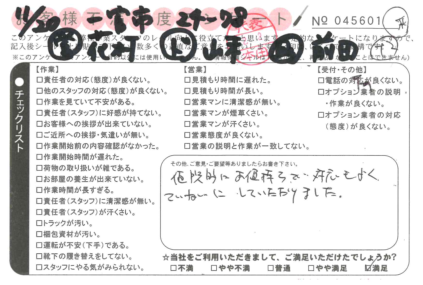 11/20 引越 営業:花村 ドライバー:山末 スタッフ:前田* 値段的にお値打ちで、対応もよく