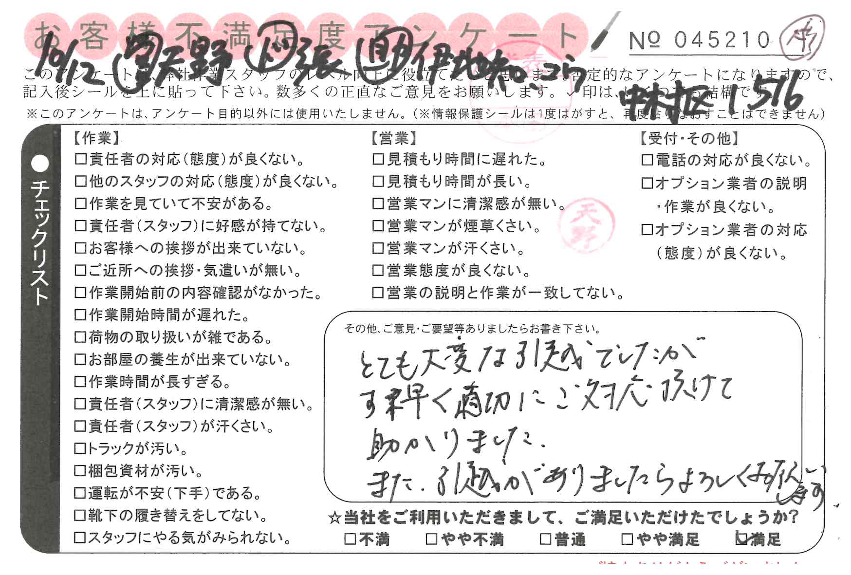 10/20 引越 営業:天野 ドライバー:三浦 スタッフ:前田* 不満点は特に何もありません。