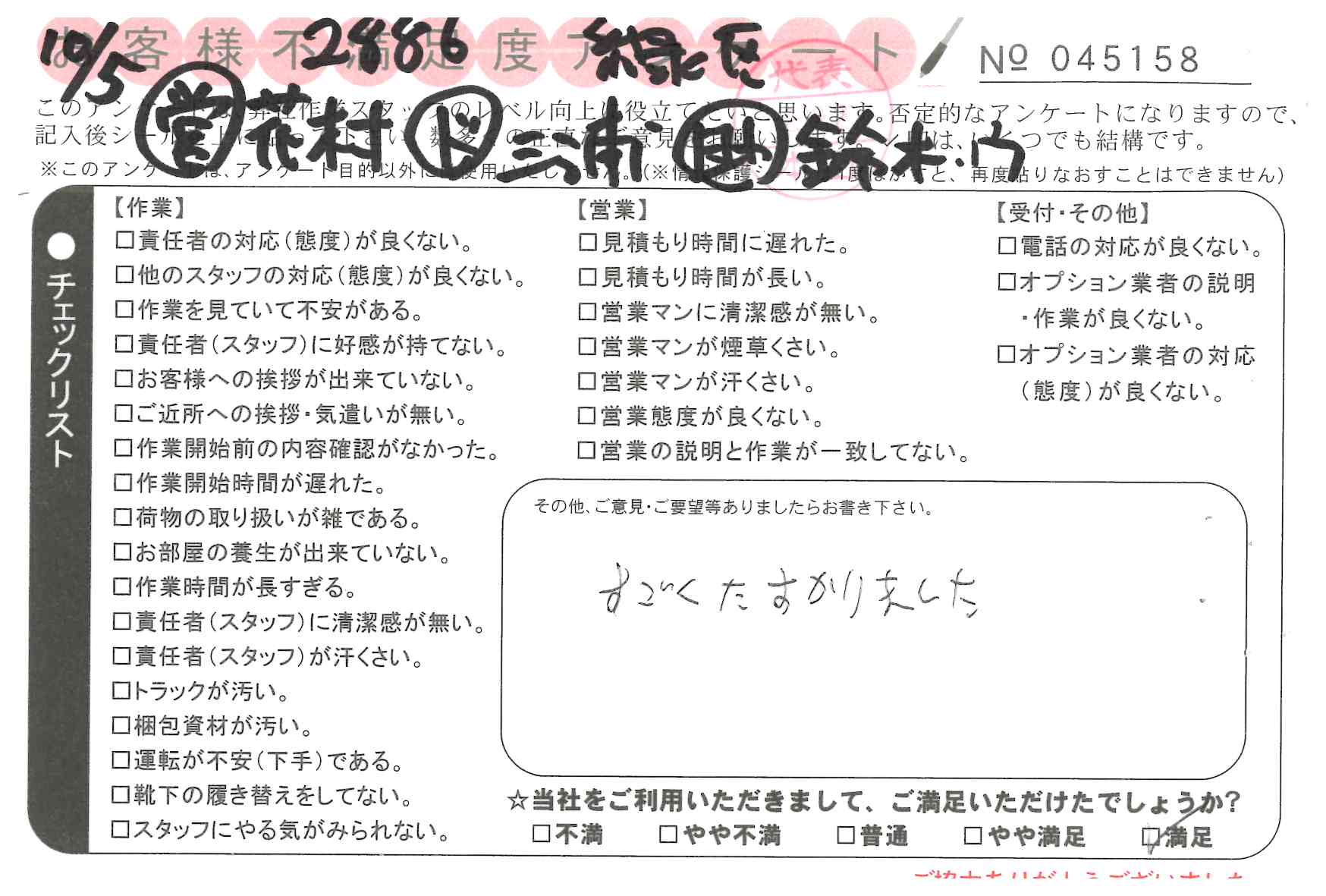 10/5 引越 営業:花村 ドライバー:三浦 スタッフ:鈴木・ウ* すごくたすかりました。
