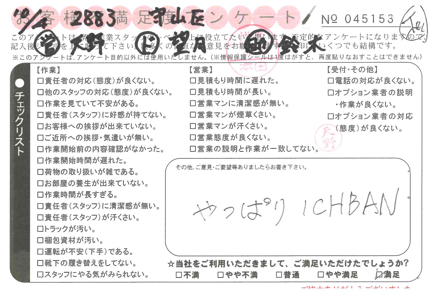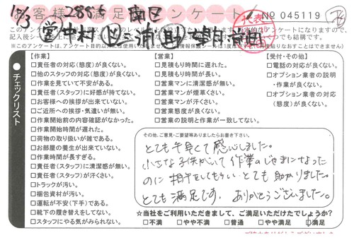 10/4.5 引越 営業:中村 ドライバー:藤田 スタッフ:高* ご丁寧にありがとうございました。
