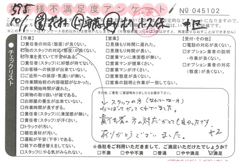 10/2 引越 営業:堀部 ドライバー:安藤 スタッフ:ホウ* 何一つ不満はなく、むしろテキパキと早く