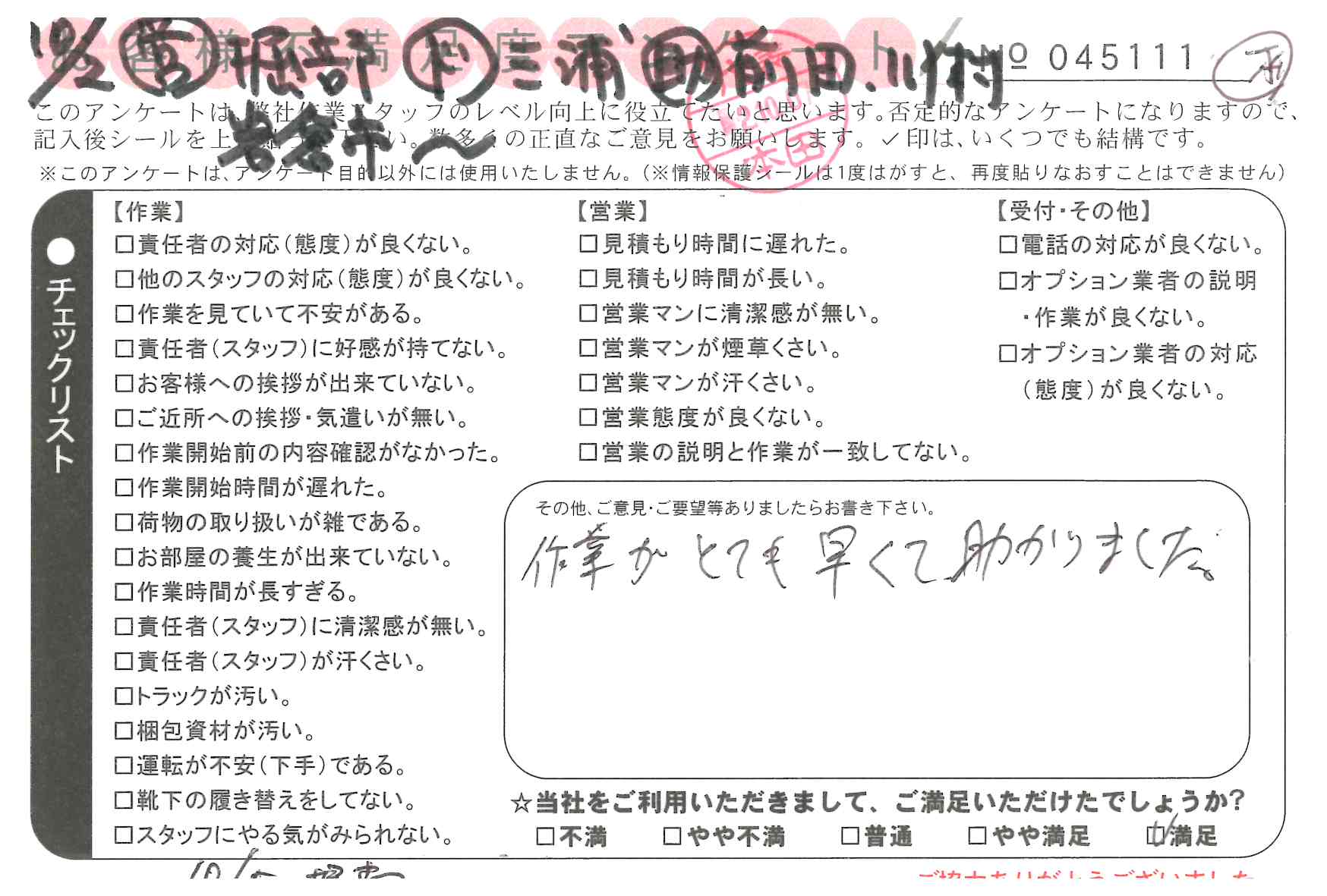 10/2 引越 営業:中村 ドライバー:三浦 スタッフ:前田・川村* 早急に作業していただき、大変助かりました。