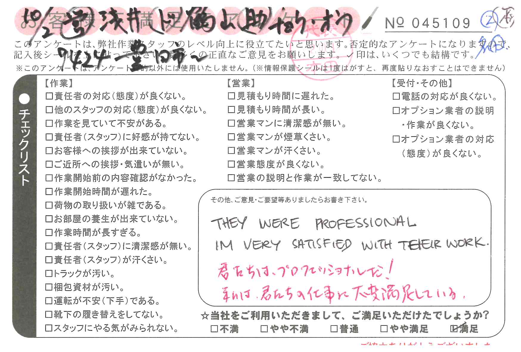 10/2 引越 営業:浅井 ドライバー:鶴山 スタッフ:チョウ・オウ*THEY WERE PROFESSIONAL IM VERY SATISFIED WITE TEIEIR WORK