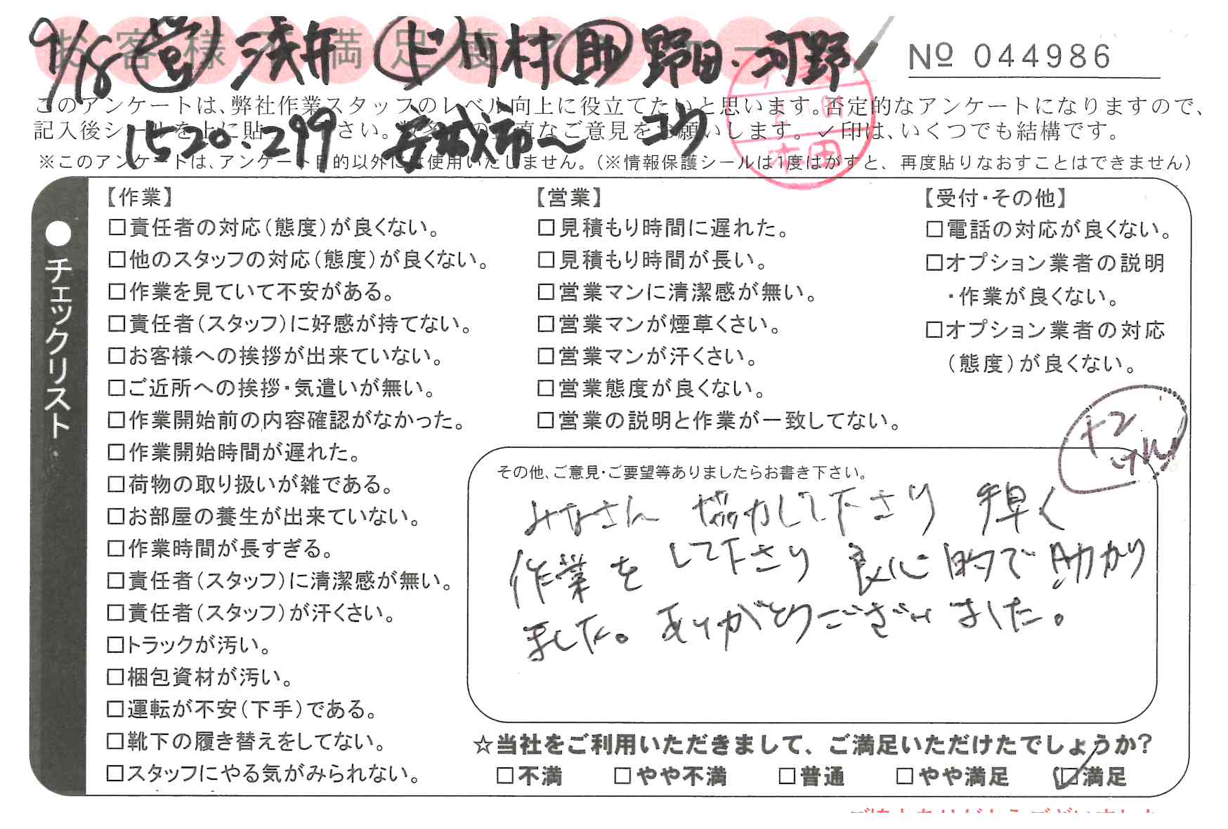 9/19 引越 営業:花村 ドライバー:川村 スタッフ:楊・山末・張* 大変良くして頂きました。ありがとうございました。