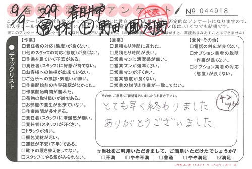 9/9 引越 営業:中村 ドライバー:野田 スタッフ:河野* とても早く終わりました。