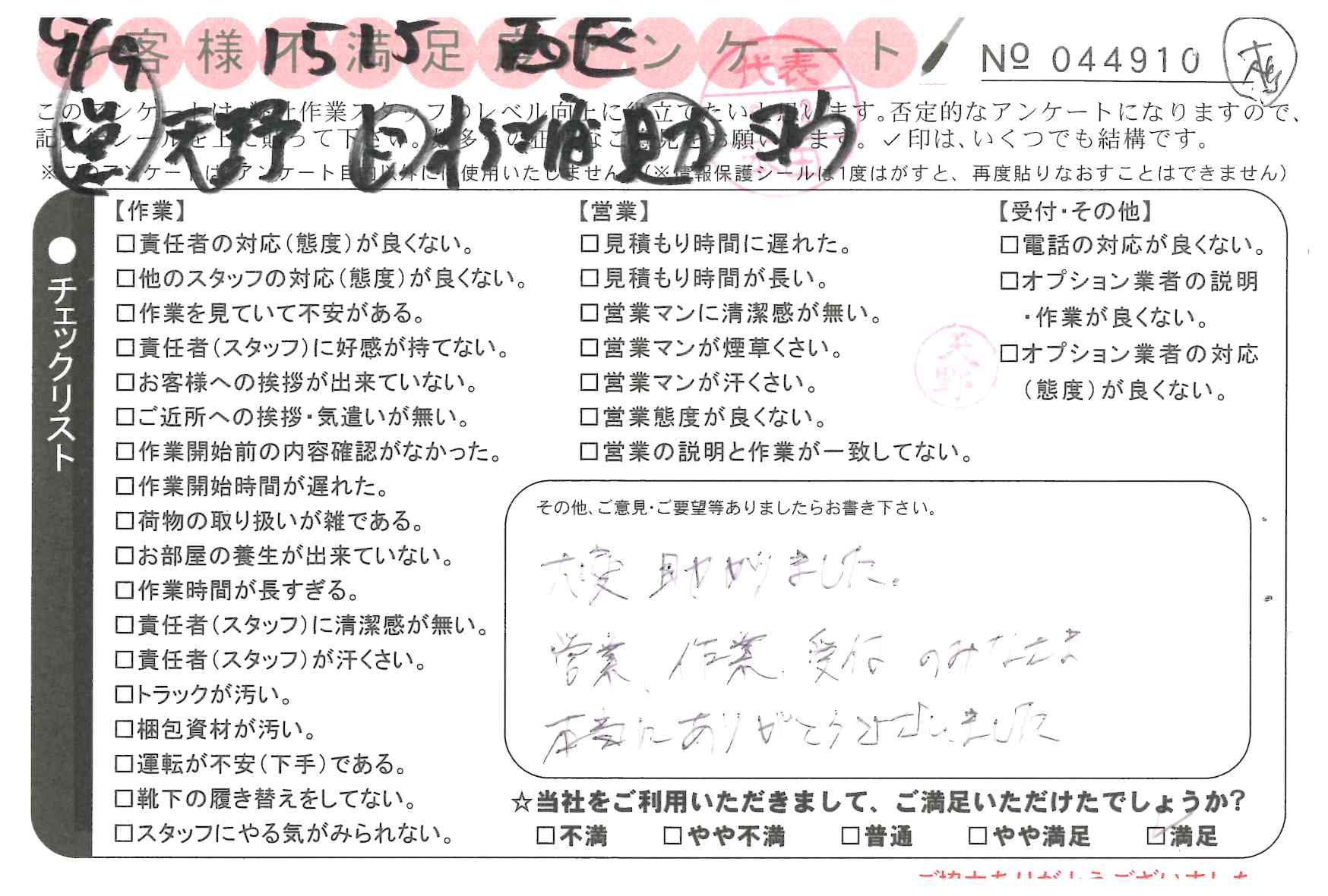 引越一番でお引越しをしていただいたお客様のうち、コメントいただいたアンケートを全て掲載しています。