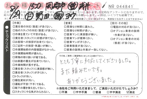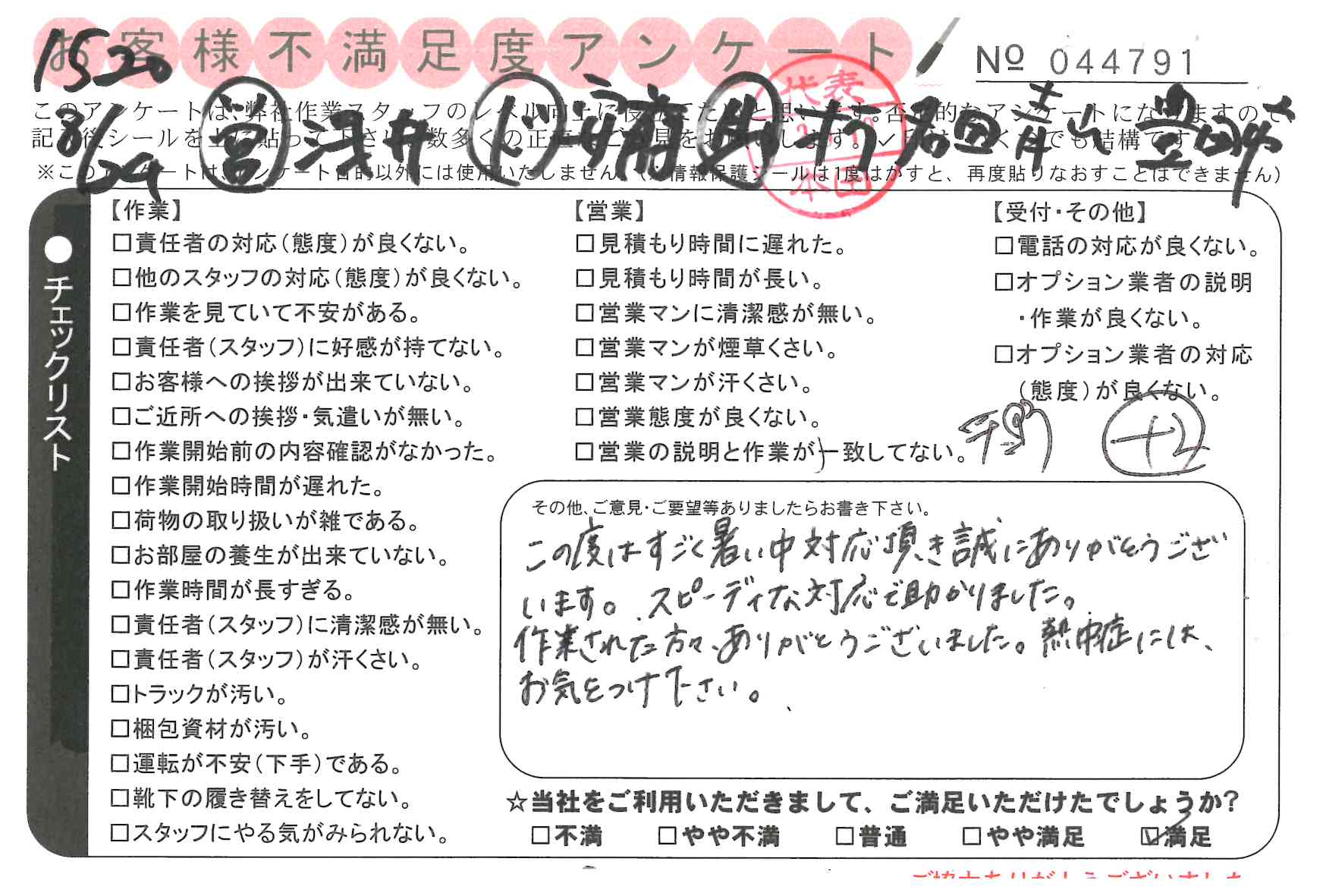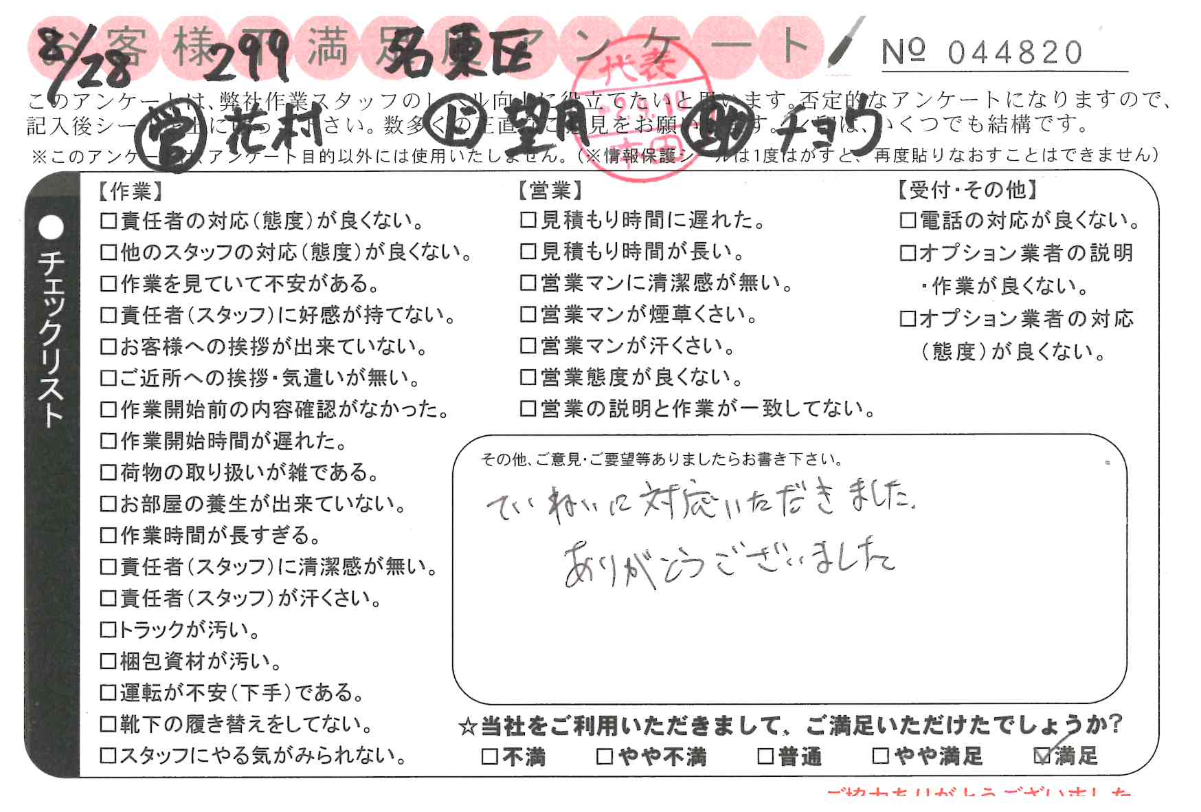 8/29 引越 営業:浅井 ドライバー:張 スタッフ:伊地知* 悪いところ特になく満足です。
