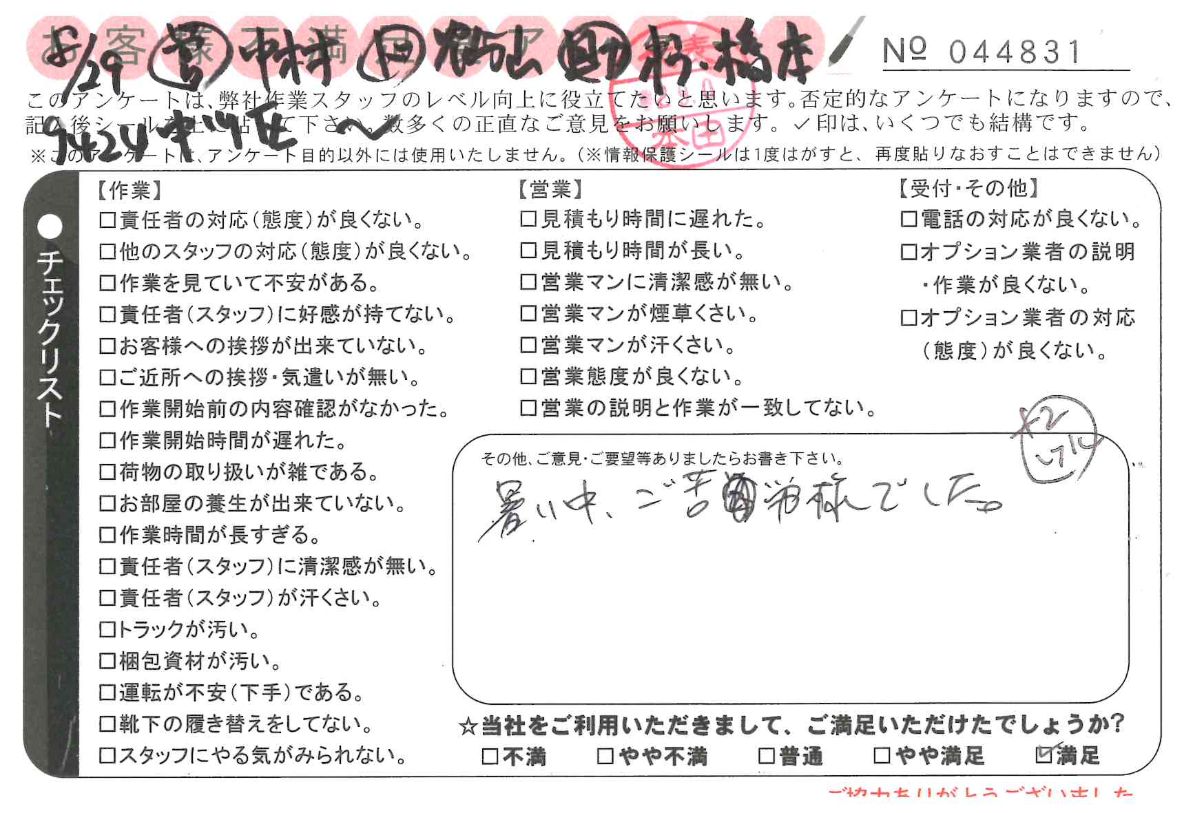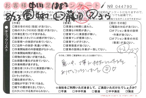 8/23 引越 営業:中村 ドライバー:藤田 スタッフ:楊* 暑い中、丁寧に対応していただき、