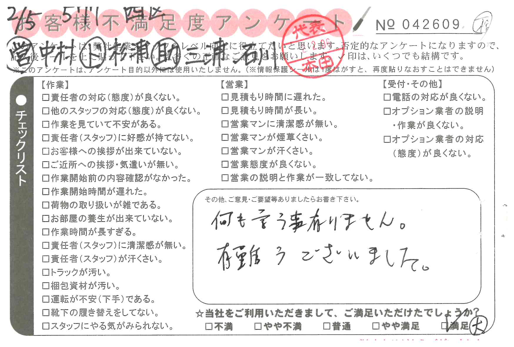 2/5 引越 営業:中村 ドライバー:杉浦 スタッフ:三浦・石川* 何も言う事有りません。有難うございました。