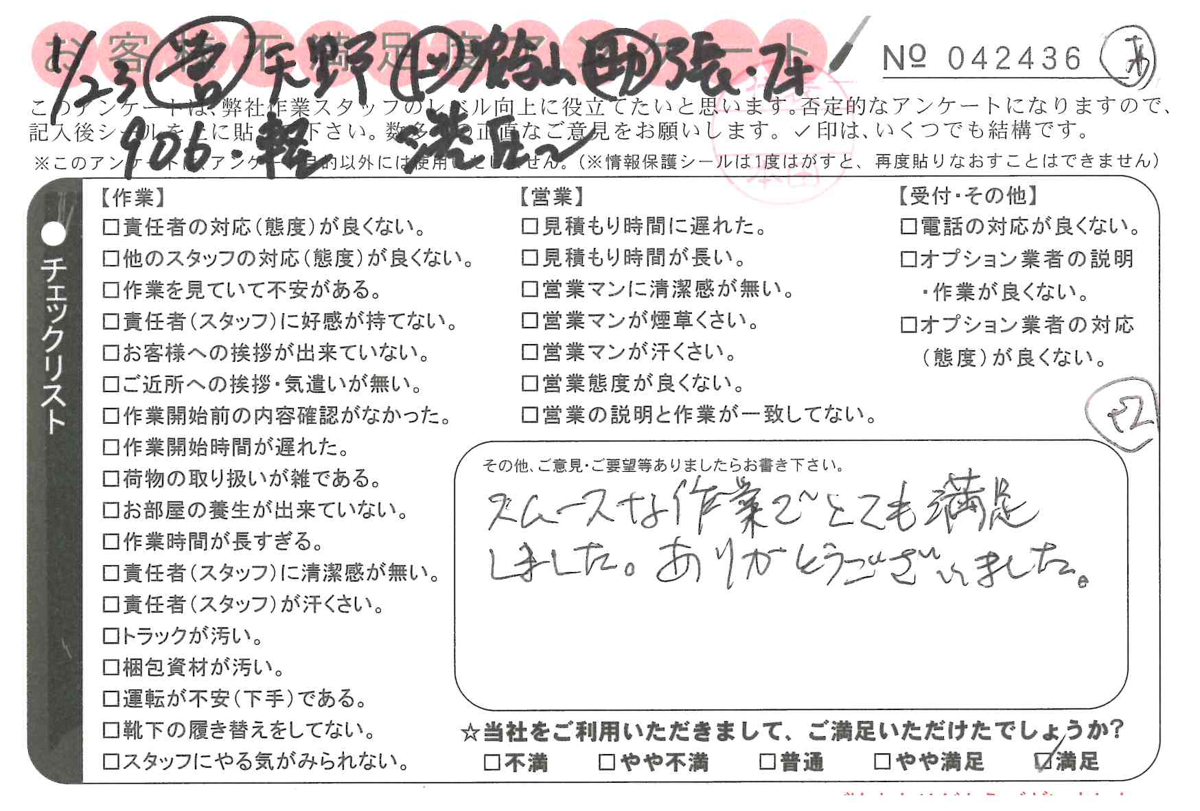 1/22 引越 営業:堀部 ドライバー:野田 スタッフ:本名* 不満等はありません。丁寧に対応して頂きました。