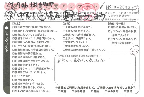 1/10 引越 営業:浅井 ドライバー:本名 スタッフ:楊・高* 責任者の対応が良い。