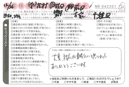 12/26 引越 営業:花村 ドライバー:望月 スタッフ:古家* 大変助かりました。不満な点はございません。