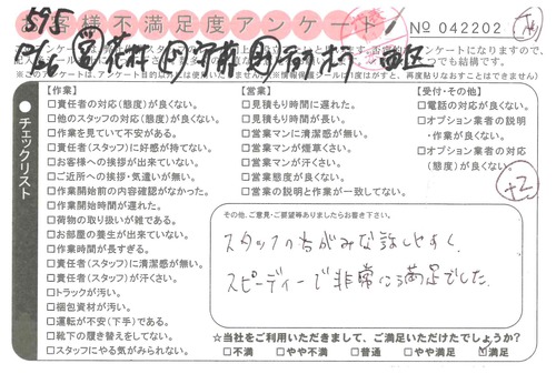 引越一番でお引越しをしていただいたお客様のうち、コメントいただいたアンケートを全て掲載しています。