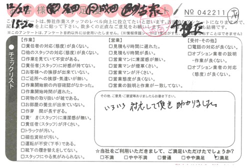 12/27 引越 営業:天野 ドライバー:本名 スタッフ:オウ・高・古家・成田* とても、よくしてくれました。ありがとうございました。