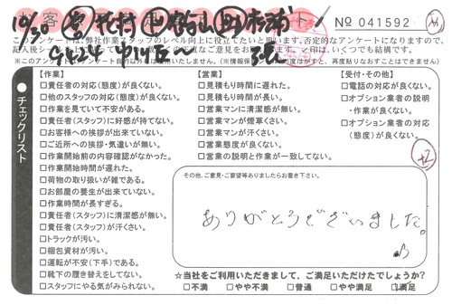 引越一番でお引越しをしていただいたお客様のうち、コメントいただいたアンケートを全て掲載しています。