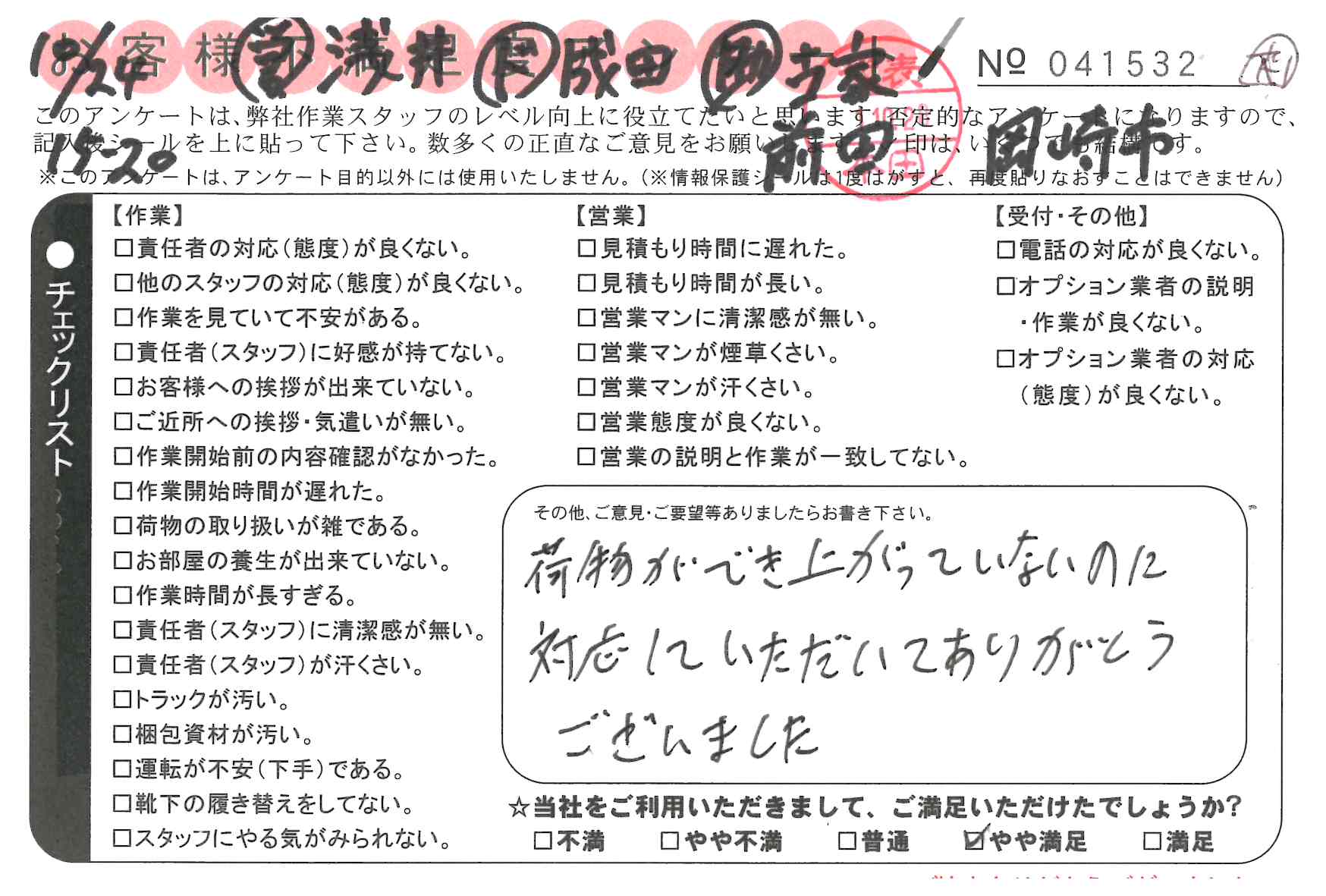 に引越しができました。ありがとうございました。