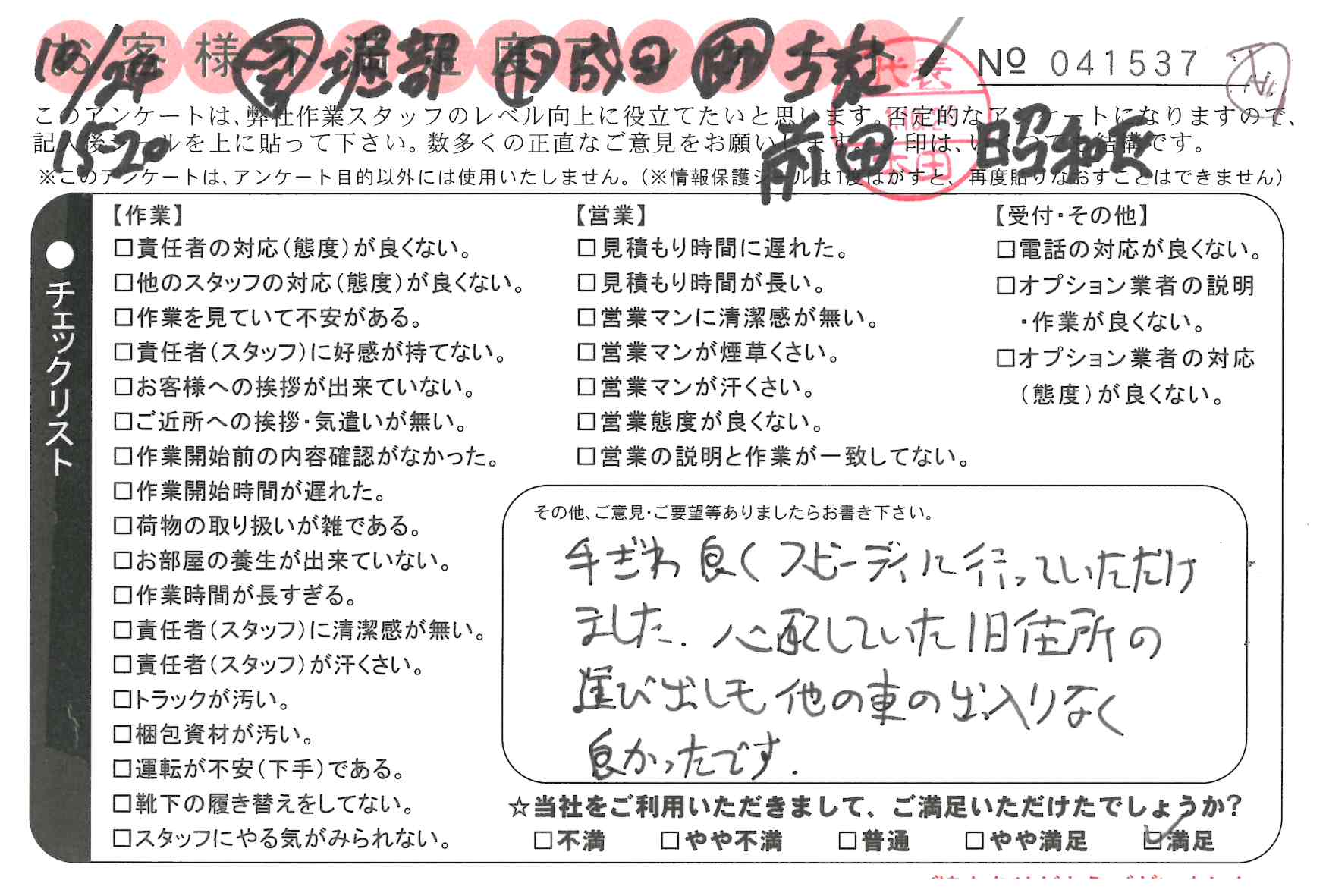 10/25 引越 営業:天野 ドライバー:三浦・成田 スタッフ:柴田・楊* とても親切で助かりました。ありがとうございます。
