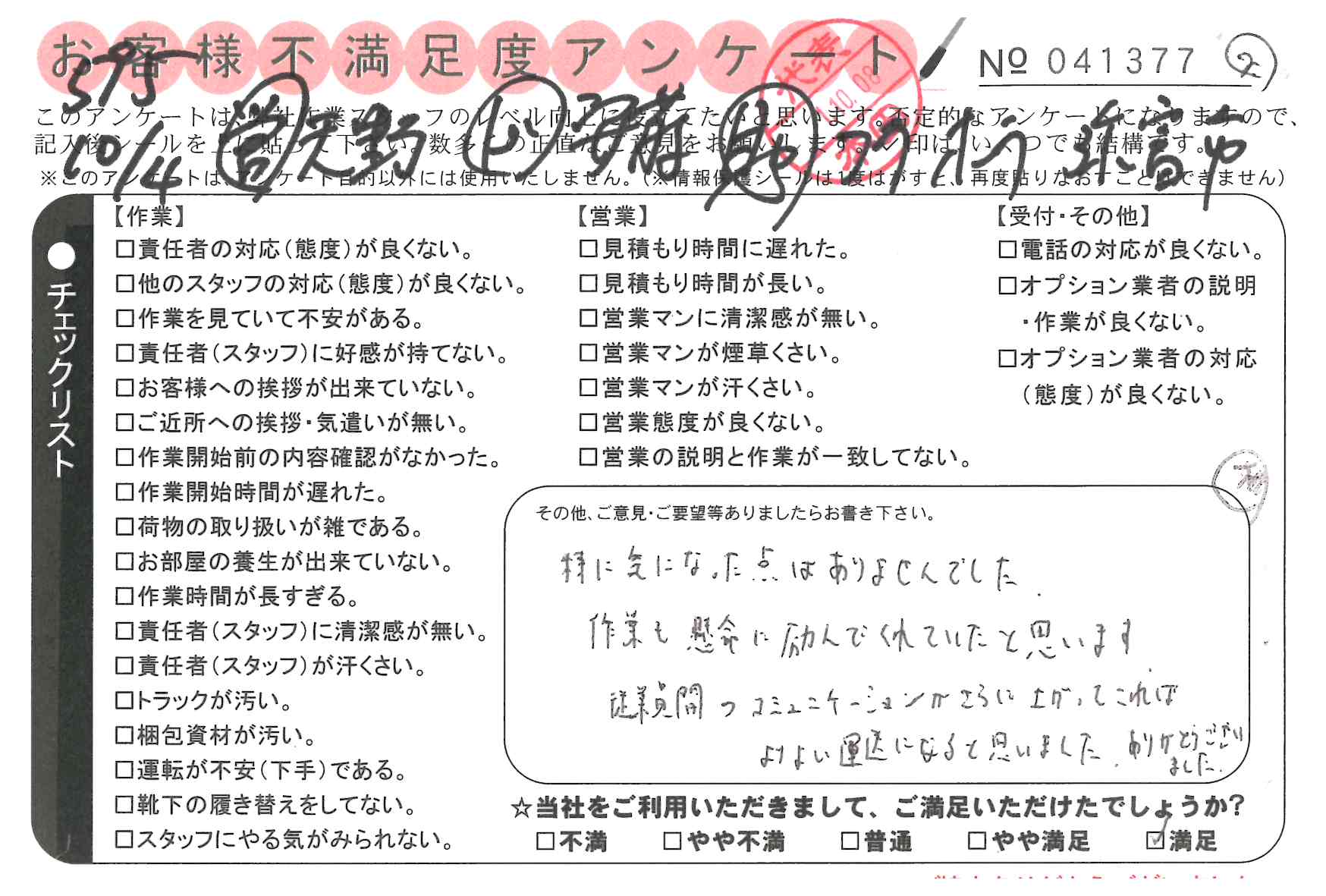 10/4 引越 営業:天野 ドライバー:安藤 スタッフ:高・オウ* 特に気になった点はありませんでした。作業も