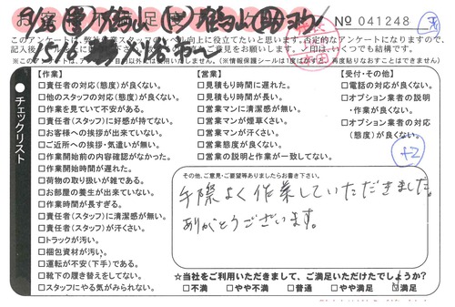 引越一番でお引越しをしていただいたお客様のうち、コメントいただいたアンケートを全て掲載しています。