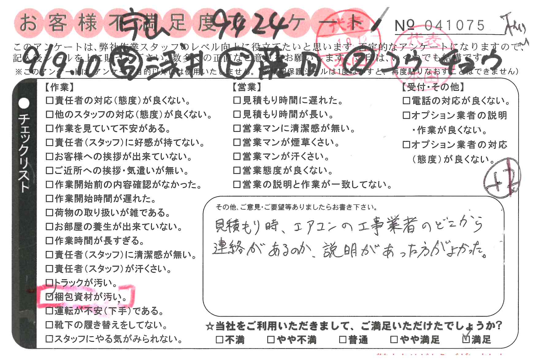 9/9.10 引越 営業:浅井 ドライバー:藤田 スタッフ:高・赵* 見積もり時、エアコンの工事業者のどこから