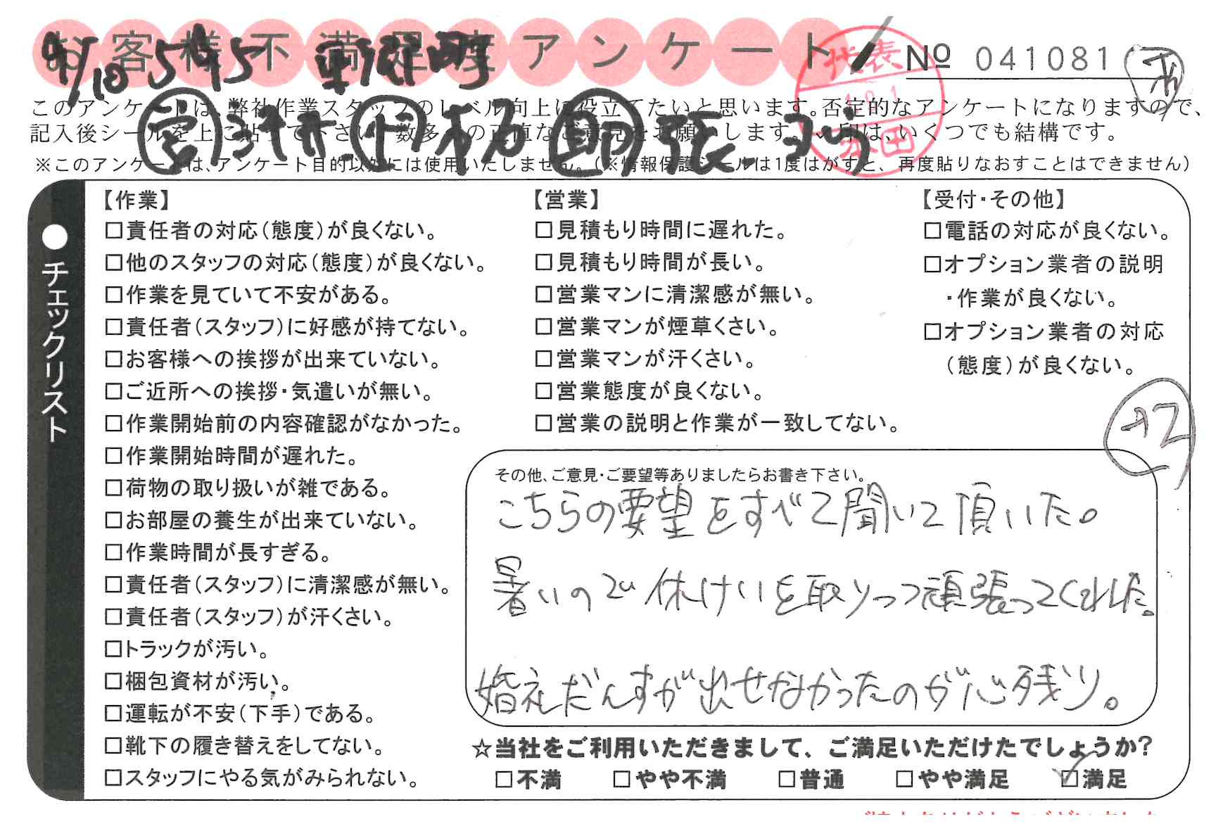 9/10 引越 営業:浅井 ドライバー:本名 スタッフ:張・楊* こちらの要望をすべて聞いて頂いた。暑いので