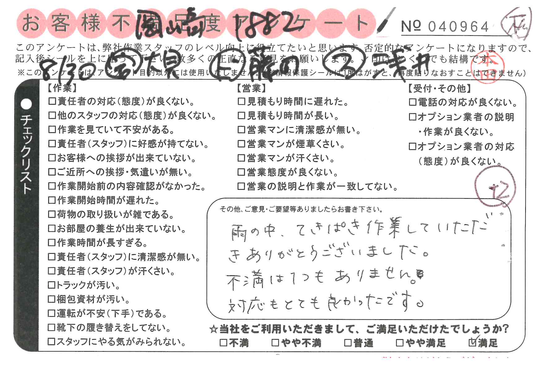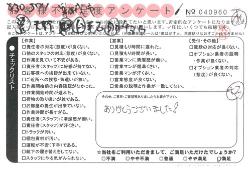 引越一番でお引越しをしていただいたお客様のうち、コメントいただいたアンケートを全て掲載しています。
