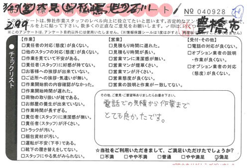 引越一番でお引越しをしていただいたお客様のうち、コメントいただいたアンケートを全て掲載しています。