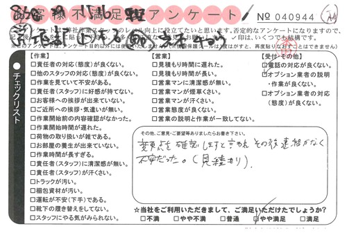 8/28 引越 営業:堀部 ドライバー:本名 スタッフ:岩本・赵* 変更点を確認しますと言われ、その後連絡がなく
