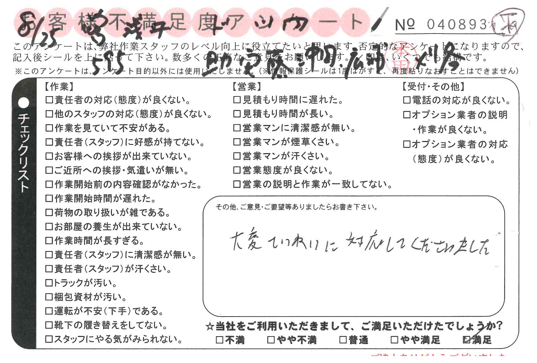 8/25 引越 営業:浅井 ドライバー:川内 スタッフ:安藤・沖田・広浦* 大変ていねいに対応してくださいました。