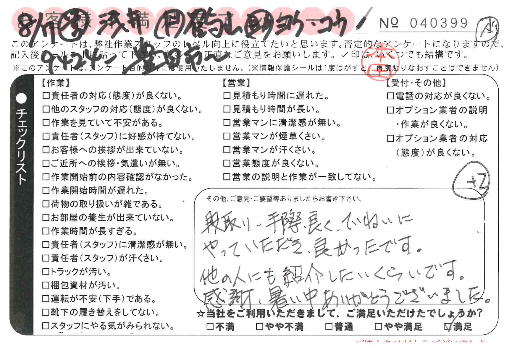 8/8 引越 営業:名田 ドライバー:鶴山 スタッフ:張・赵・高* 担当者の方、全員が気持ちよく対応してください