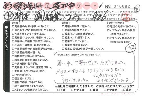 8/3 引越 営業:浅井 ドライバー:楠本 スタッフ:稲葉・高* 暑い中、丁寧にやっていただけました。ガラスが