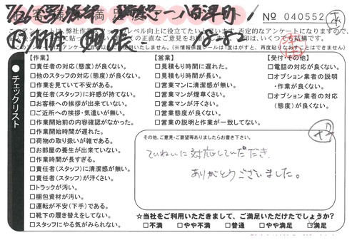 引越一番でお引越しをしていただいたお客様のうち、コメントいただいたアンケートを全て掲載しています。