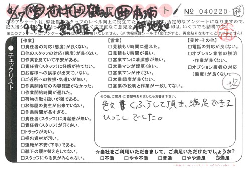 引越一番でお引越しをしていただいたお客様のうち、コメントいただいたアンケートを全て掲載しています。