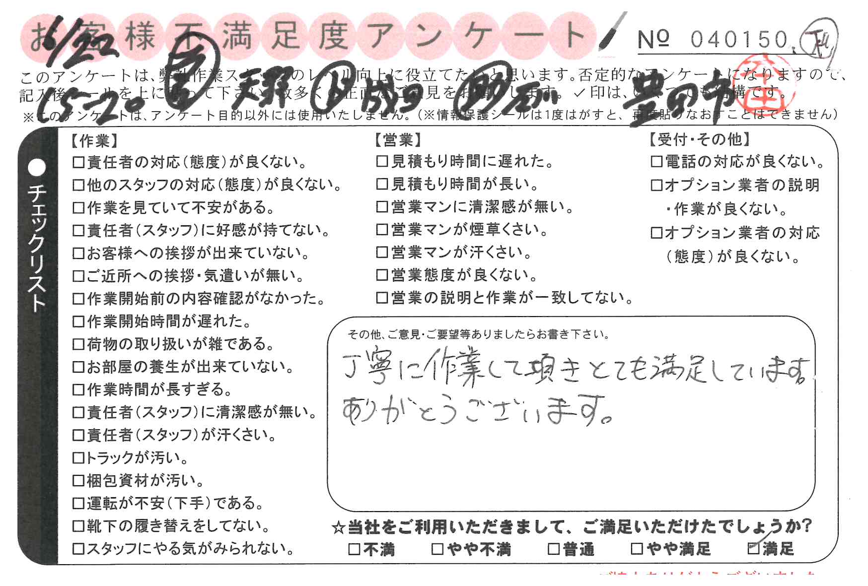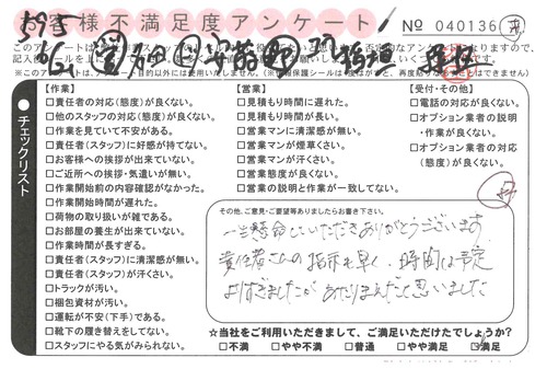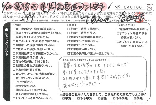 引越一番でお引越しをしていただいたお客様のうち、コメントいただいたアンケートを全て掲載しています。