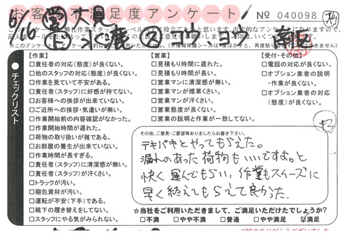 引越一番でお引越しをしていただいたお客様のうち、コメントいただいたアンケートを全て掲載しています。