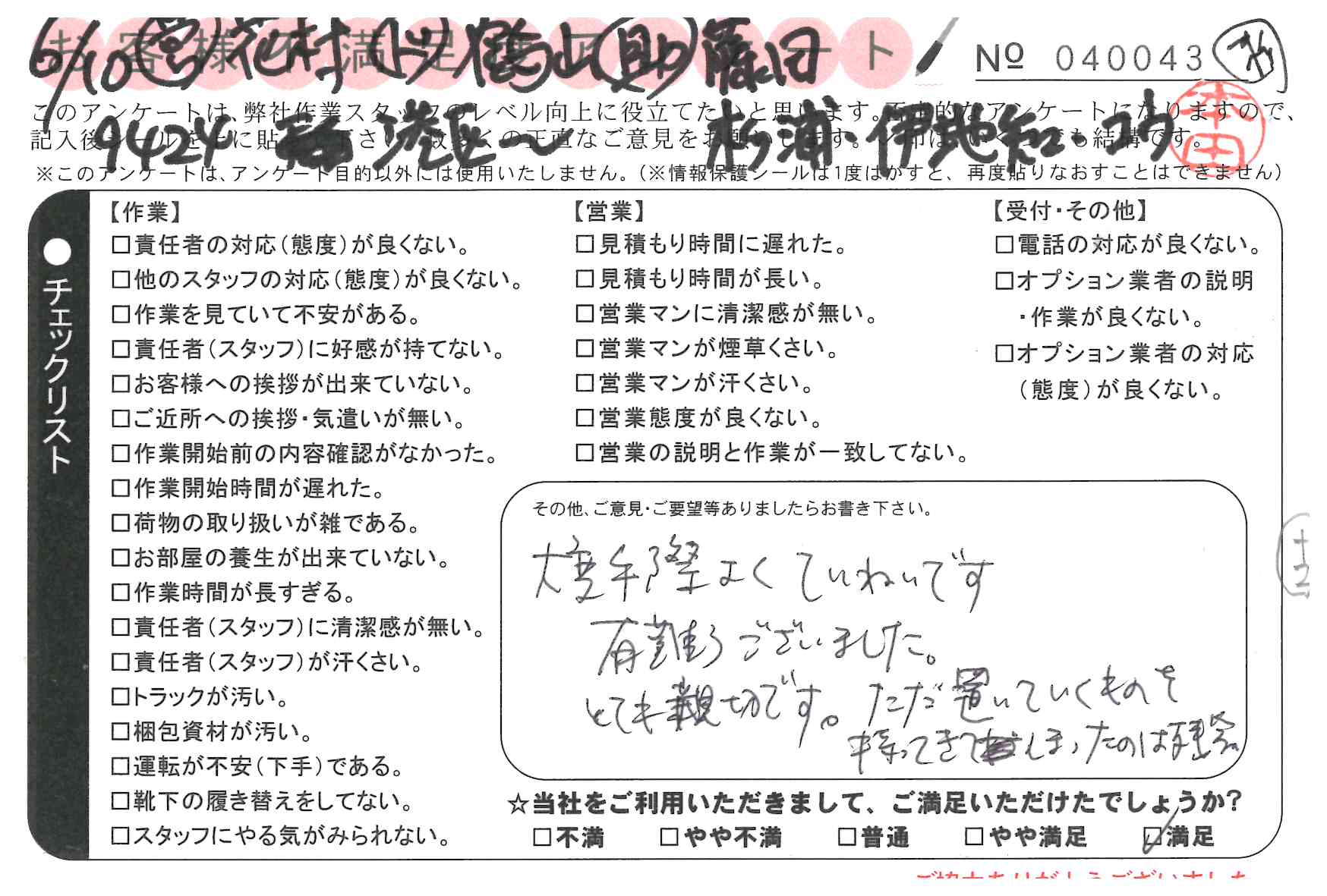 6/10 引越 営業:花村 ドライバー:鶴山 スタッフ:藤田・杉浦・伊地知・高* 大変手際よくていねいです。有難うございました。