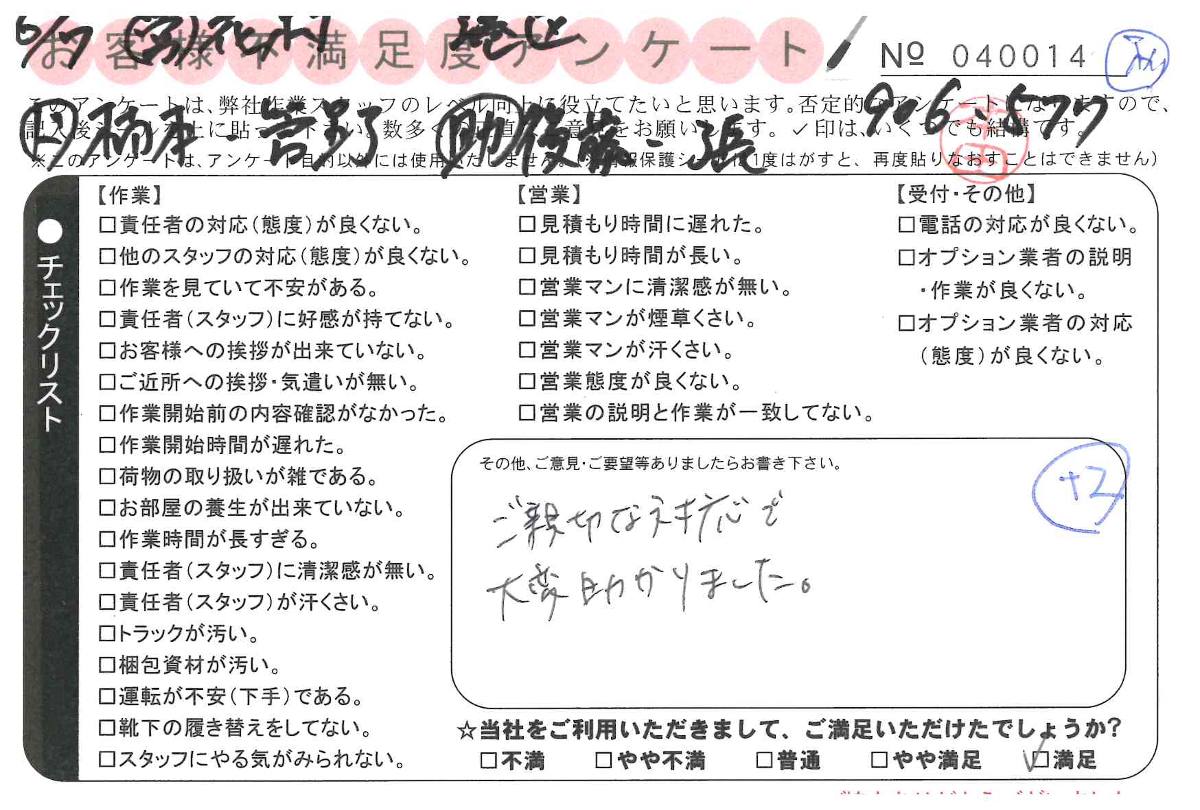 6/9 引越 営業:青木 ドライバー:川内 スタッフ:張* 段取り良くムダのない作業で良かった。