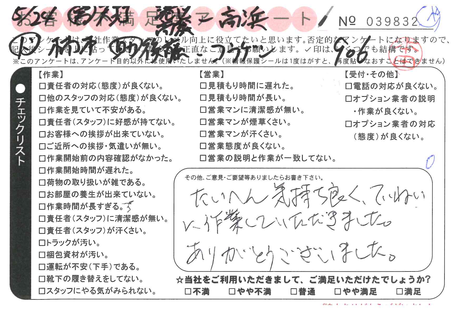 5/24 引越 営業:天野 ドライバー:鶴山 スタッフ:張* 予定時間より1時間も早く作業開始していただき