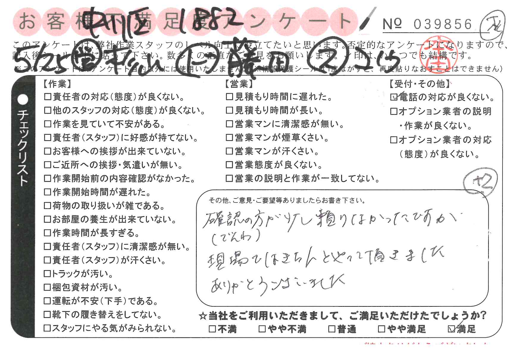 5/25 引越 営業:杉山 ドライバー:藤田 スタッフ:高* 確認(でんわ)の方が少し頼りなかったですが、