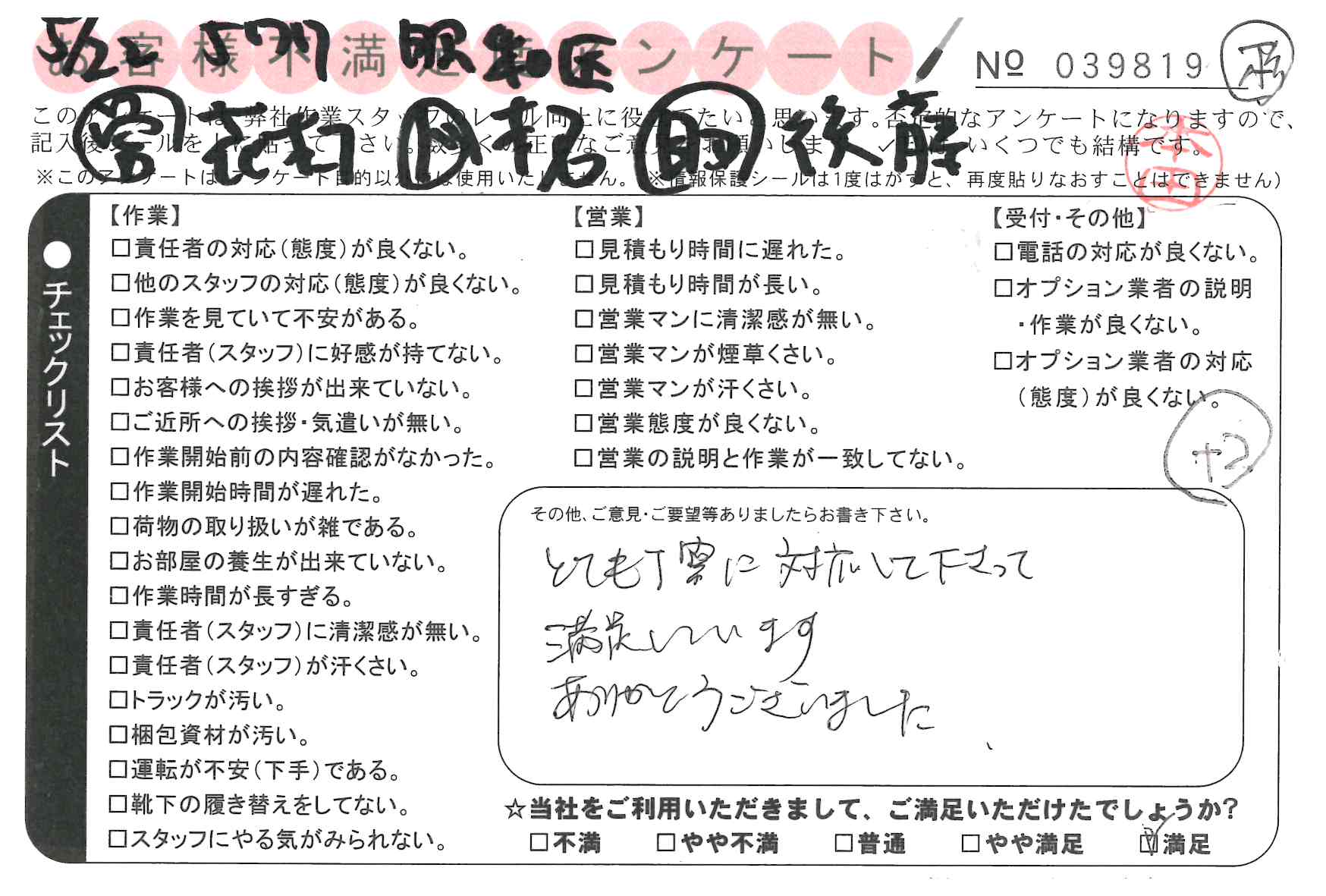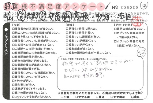 引越一番でお引越しをしていただいたお客様のうち、コメントいただいたアンケートを全て掲載しています。