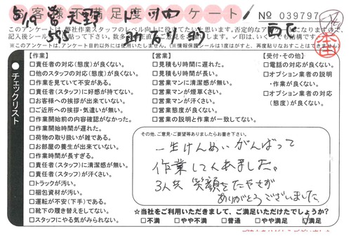 引越一番でお引越しをしていただいたお客様のうち、コメントいただいたアンケートを全て掲載しています。