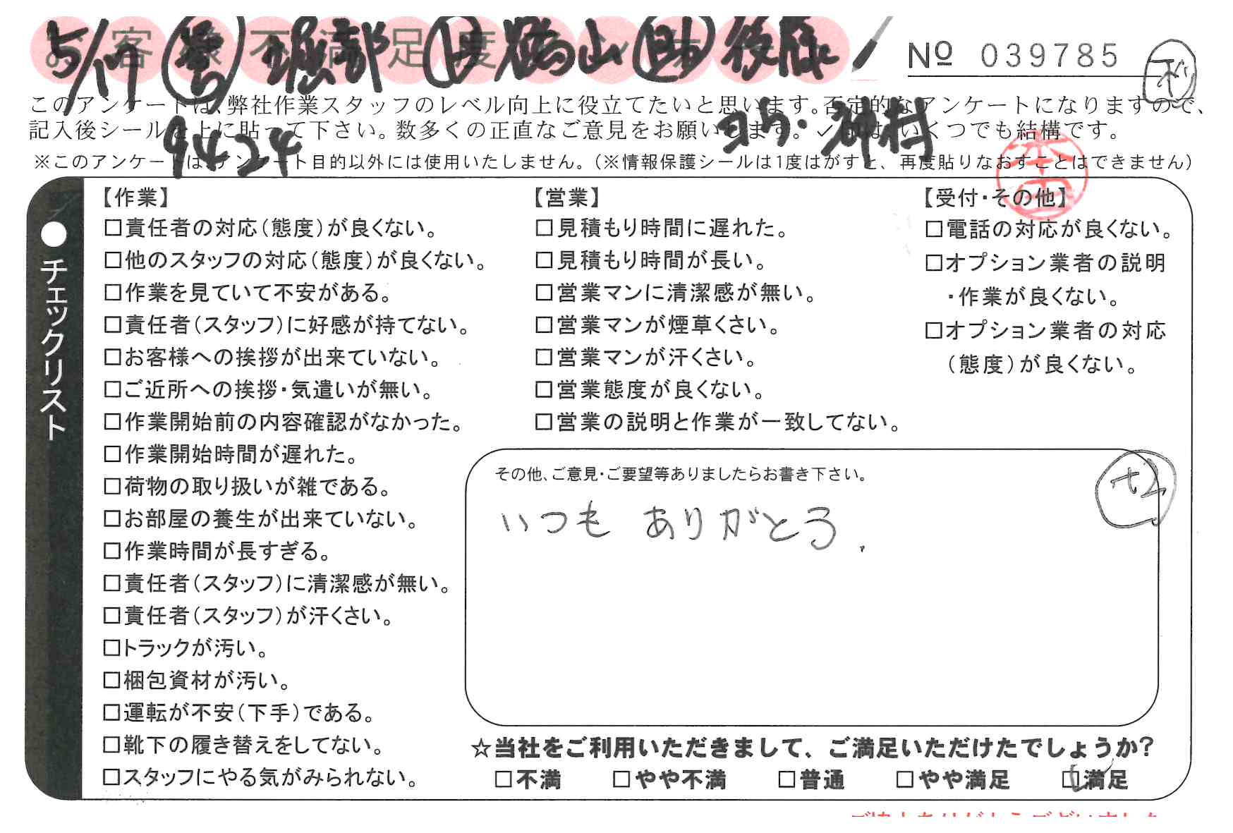 5/19 引越 営業:堀部 ドライバー:水漉 スタッフ:高* 良く対応していただきました。