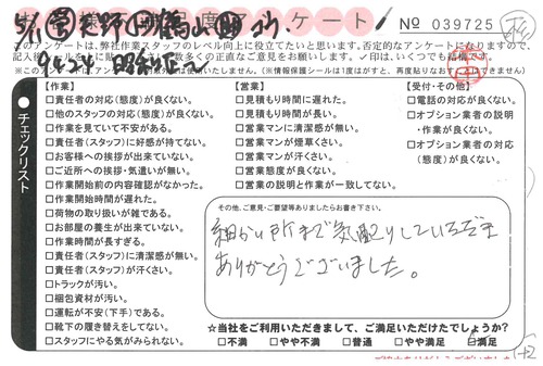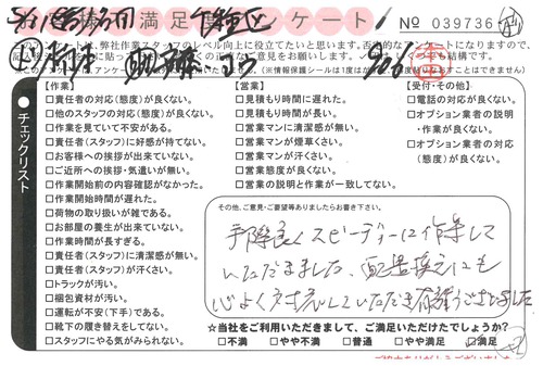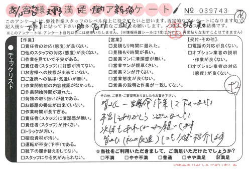 引越一番でお引越しをしていただいたお客様のうち、コメントいただいたアンケートを全て掲載しています。